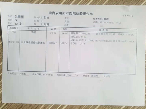 辗转了多家医院,经过了一系列的检查治疗,并在一年前进行了输卵管吻合术,但治疗效果不佳,一直未孕。日复一日的治疗折磨使吴女士失去了信心,在绝望之际,经朋友介绍(不孕患者,在安琪治疗,并以怀孕),于2018年8月19日来到了安琪不孕不育科,经向恒新主任检查诊断、反复评估病史、制定个性化的治疗方案。运用中西结合疗法,治疗和身体调理同时进行,前后短短2个多月,于11月9日在院检查,吴女士已成功受孕,实现了做妈妈的梦想!