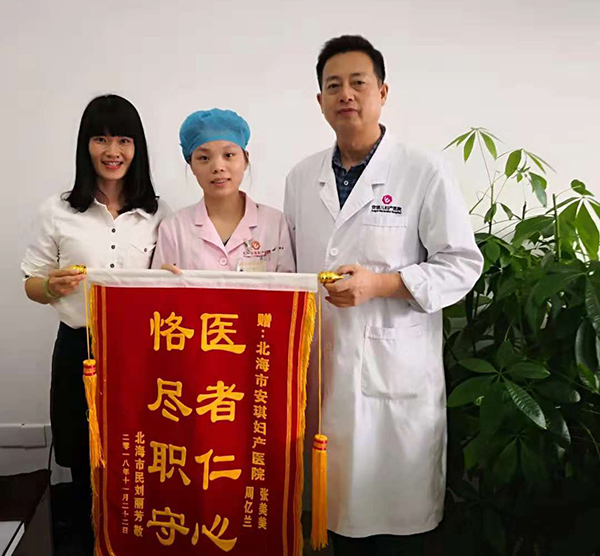 原来在2016年12月6日,刘女士曾在北海安琪妇产医院分娩。因待产期间,心情忧郁,精神紧张,妇产科于喜峰主任和助产士周忆兰、张美美了解情况后,便经常来到她的病床前,与她聊聊家常,千方百计的缓解产妇的紧张情绪。住院待产第二天,产妇在医护人员的精心照护下顺利分娩一名健康的宝宝。出院时,由于各种因素,未来得及答谢,便匆匆的离去。