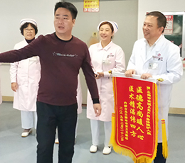 产妇家属靳先生,于2016年12月8日,将一面锦旗送给予产科于喜峰主任和麻醉科李建华及全体医护人员,感谢他们在院期间的关照。锦旗上“医术精湛品德优·服务热情如亲人”两句话,字字透露出产妇对医护人员的感激之情。